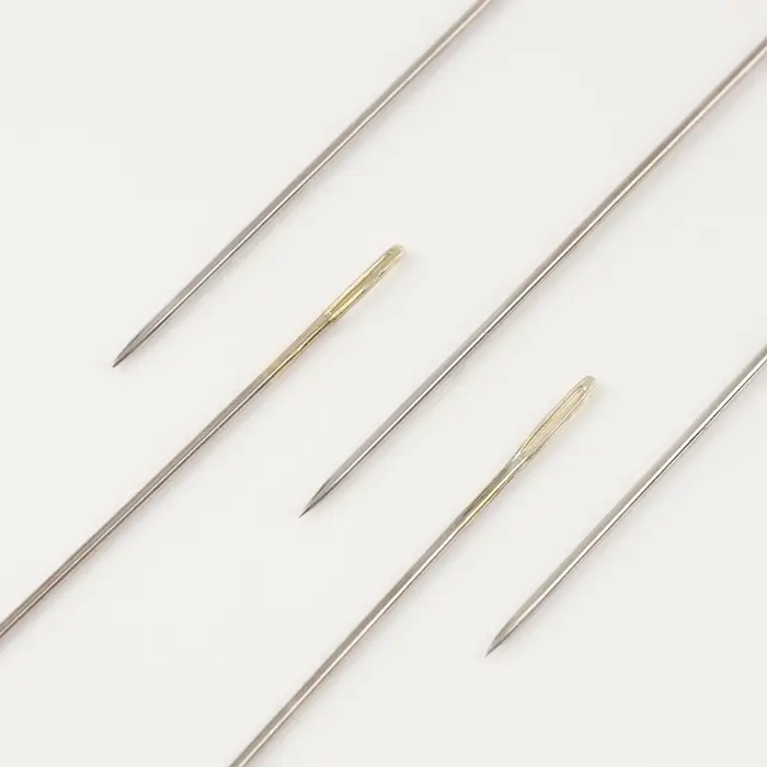 Позолоченное ушко значительно упрощает вдевание: оно идеально гладкое и не цепляет материал. В процессе шитья уменьшается нагрузка на нить, она меньше истирается. Остриё легко прокалывает полотно и позволяет проложить ровные стежки.