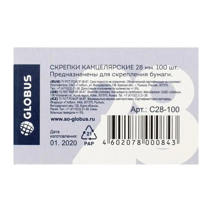 Скрепки канцелярские GLOBUS, 28 мм, 100 шт., без покрытия