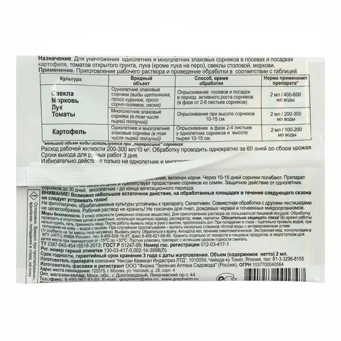 Средство эффективно только против однолетних и многолетних злаковых сорняков.