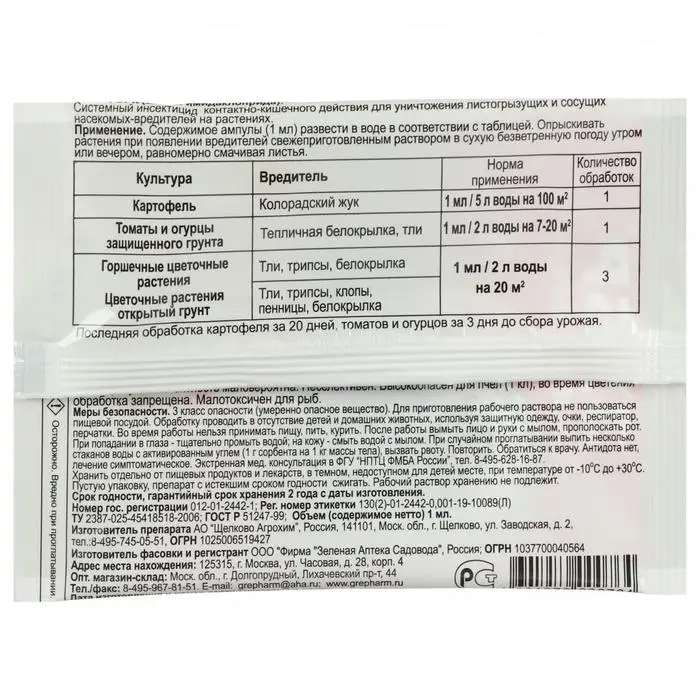 от комплекса вредителей (тли, трипса, цикадки, клопов, белокрылки и др.) на цветочных, в том числе горшечных растениях.