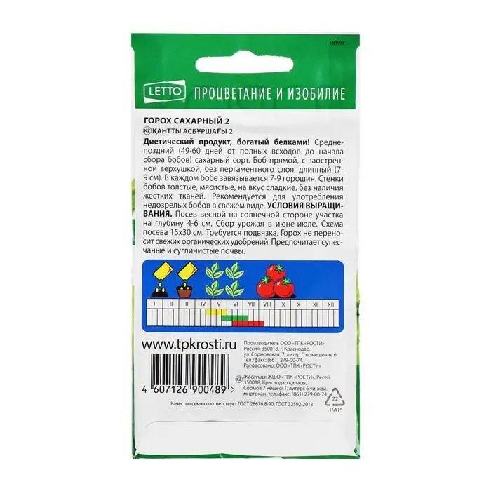 Вкусное лакомство! Раннеспелый (50-52 дня)сорт. Растение не требует подвязки. Бобы длиной 9-13 см, без пергаментного слоя и жесткого волокна. Горошины нежные, сочные, оченьсладкие. Рекомендуется для непосредственногопотребления, заморозки и консервирования.Условия выращивания. Культура влаго- исветолюбивая, холодостойкая. Посев сплошной,рядовой. Глубина заделки семян 4-6 см. Высеваютв 2-3 срока через 10-14 дней. Уход заключается всвоевременном поливе, прополках и рыхлении.