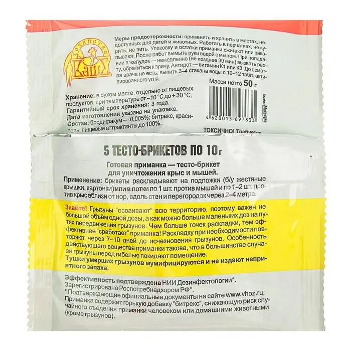 Срок годности тесто-брикетов "Ратобор" составляет 2 года, что позволяет длительное время хранить приманку без потери ее качества и эффективности. Это особенно важно для профессиональных служб по борьбе с грызунами, которые могут использовать "Ратобор" в рамках комплексных программ по обработке территорий от вредителей.