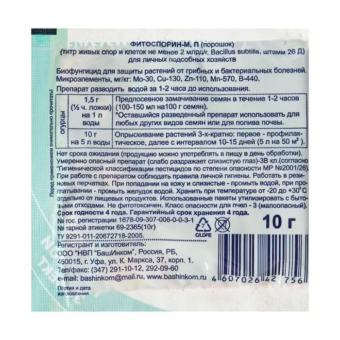 Состав: концентрация действующего вещества — титр живых клеток и спор Bacillus subtilis (штамм 26 Д), не менее 2 млрд КОЕ/г.