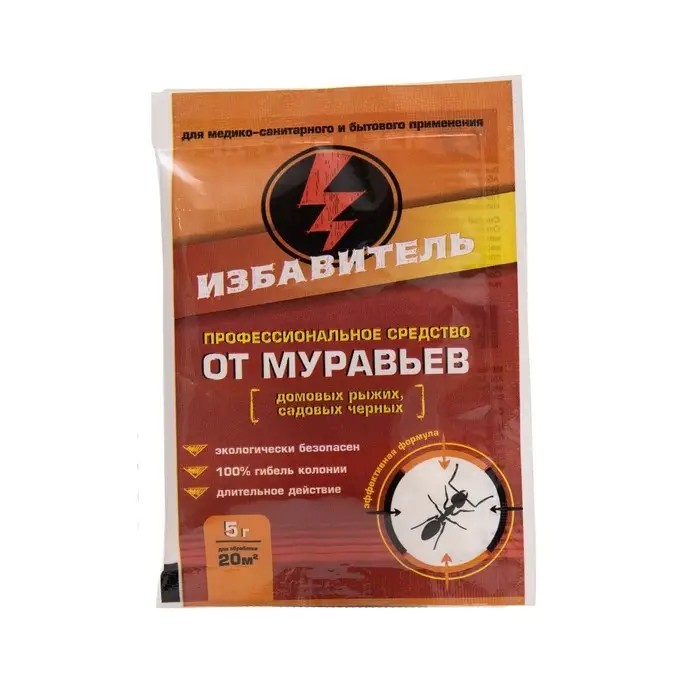 Средство «Избавитель» — готовая пищевая отравленная приманка последнего поколения для уничтожения муравьев в помещениях, в том числе жилых (садовые домики и т. д.), пищевых, детских (при размещении в местах недоступных для детей) и лечебных учреждениях.