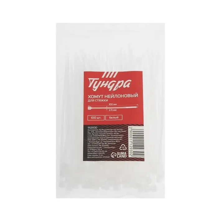 Хомут нейлоновый для стяжки, ТУНДРА, 2.5×100 мм, белый, 100 шт.