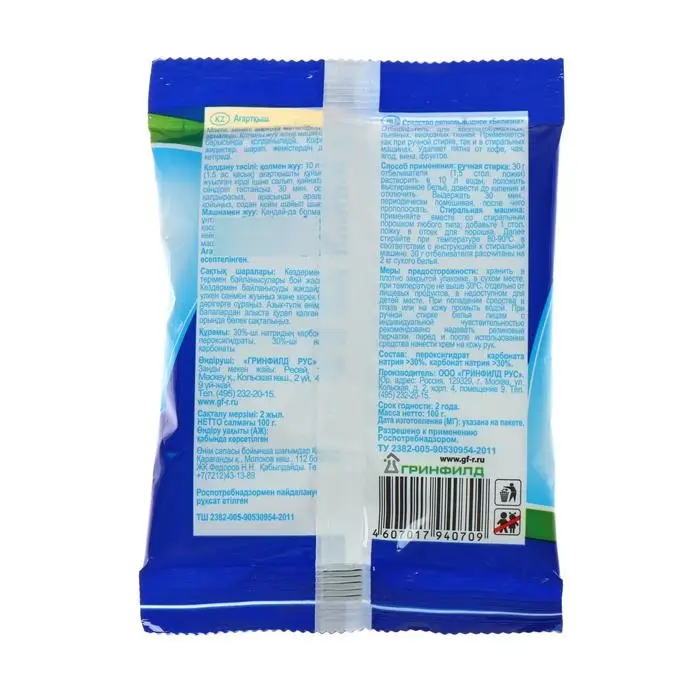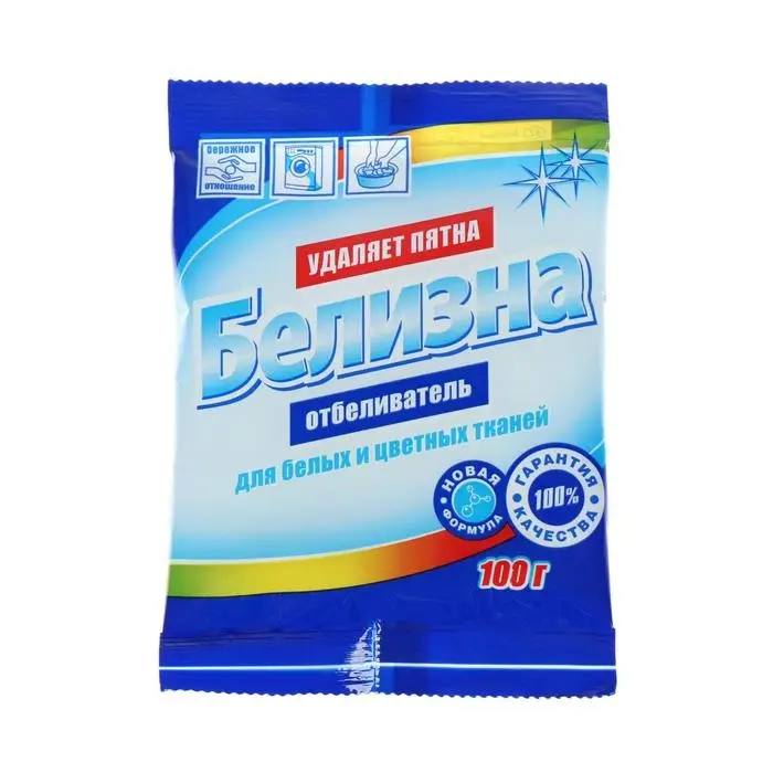 Отбеливатель для хлопчатобумажных, льняных, вискозных тканей «Белизна» применяется как при ручной стирке, так и в стиральных машинах. Удаляет пятна от кофе, чая, ягод, вина, фруктов.