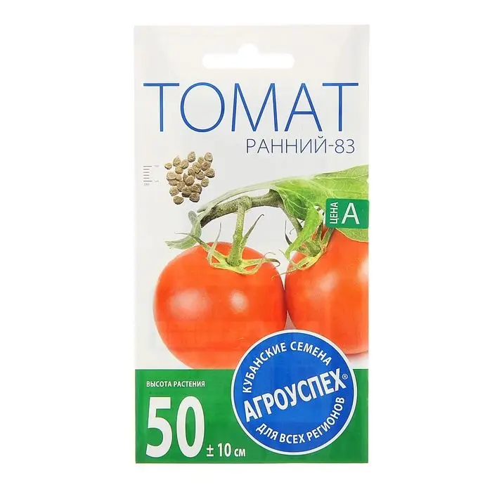 Семена «Томат Ранний–83», низкорослый, для открытого грунта, 0,3 г — сорт раннеспелый (95–110 дней от полных всходов до начала созревания) детерминантного типа, высота: 35–60 см. Плоды плоскоокруглые, массой 80–95 г с отличными вкусовыми качествами. Ценится за высокую урожайность и отличную транспортабельность.