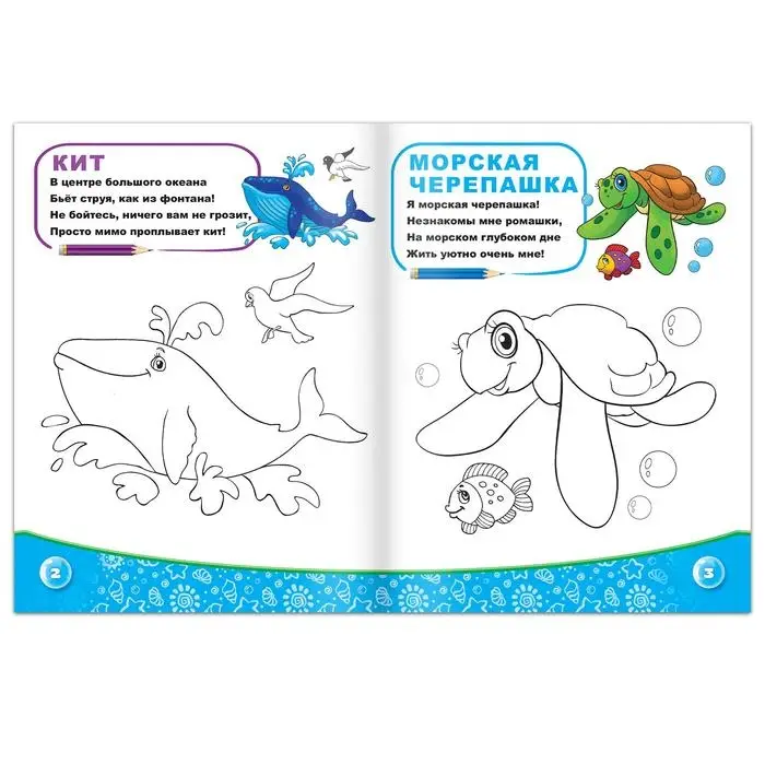 - 12 страниц с изображениями морских обитателей и заданиями для дорисовки деталей.