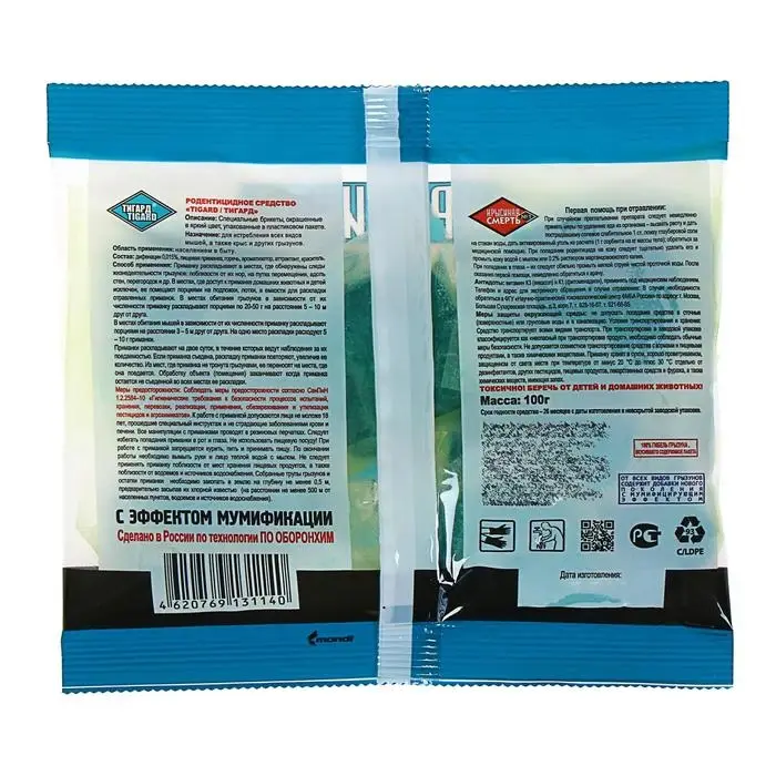 Состав: Дифенацин - 0,015 %, пищевая приманка, горечь, ароматизатор.