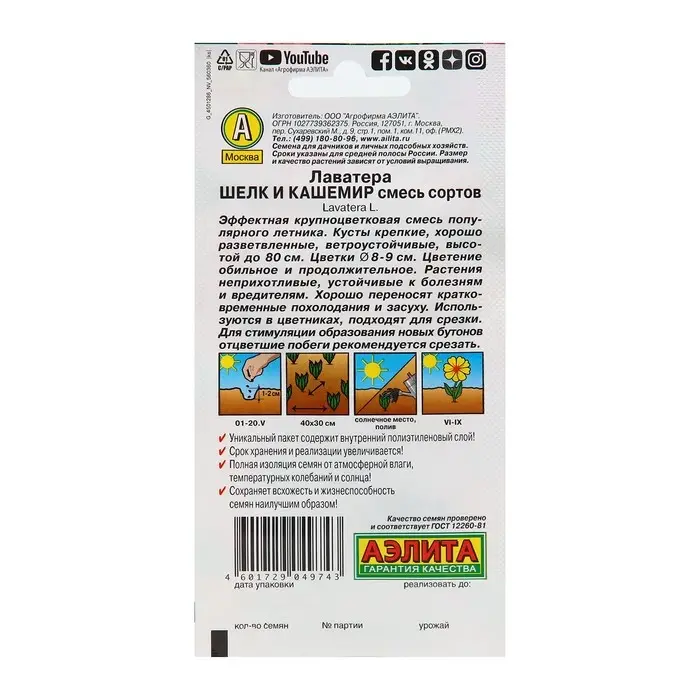 Семена цветов Лаватера "Шелк и кашемир", смесь окрасок, О, 0,3 г