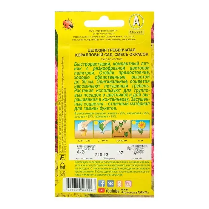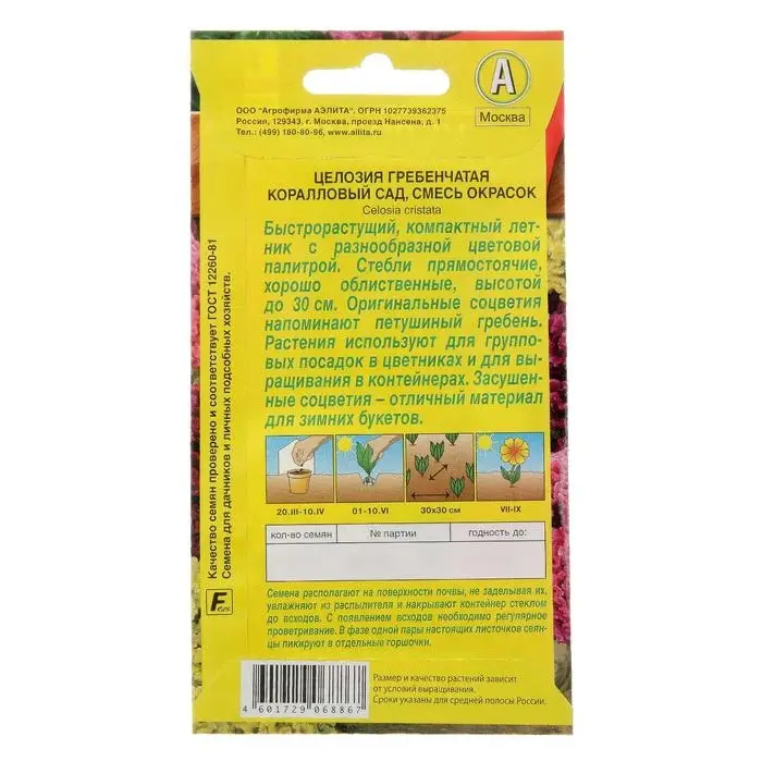 Семена цветов Целозия гребенчатая "Коралловый сад", смесь окрасок, О, 0,2 г