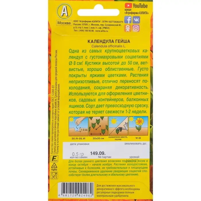 Семена цветов Календула "Гейша" махровая, О, 0,5 г