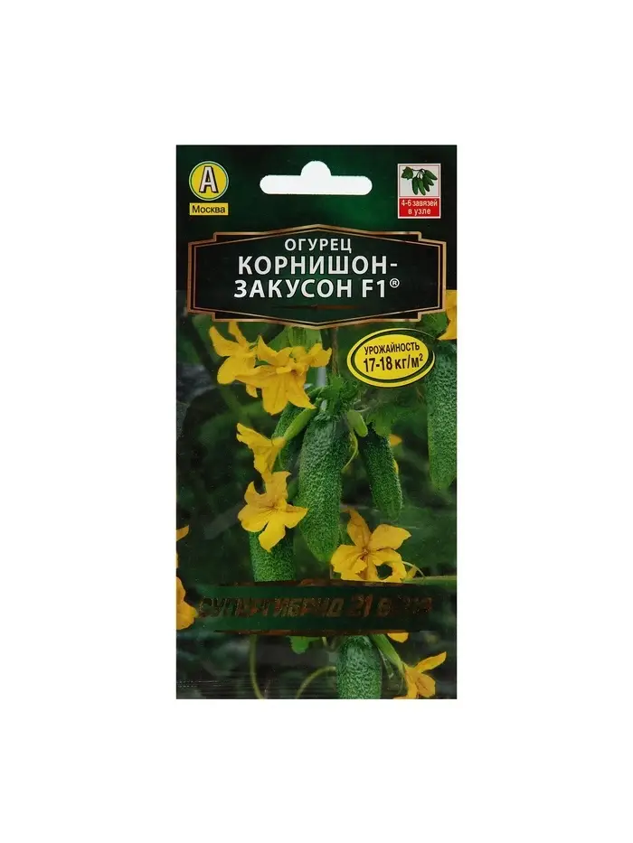 «Корнишон-закусон F1» представляет собой ультраскороспелый высокоурожайный пчелоопыляемый гибридный сорт для открытого грунта и плёночных укрытий. Растение формирует сочные хрустящие цилиндрические плоды без пустот, которые подходят для соления и консервирования.