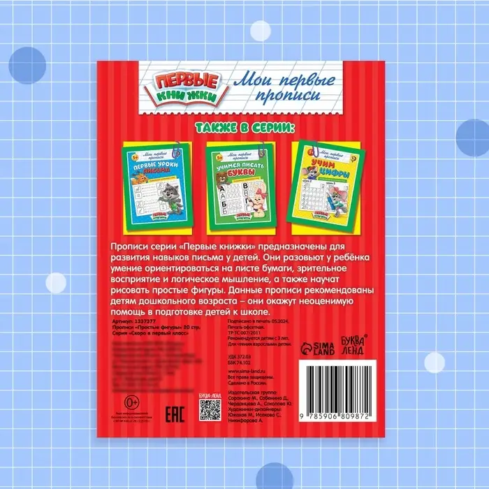 Прописи серии «Первые книжки» предназначены для детей дошкольного возраста. Они помогают развивать мелкую моторику и мышление, учат запоминать и писать буквы и цифры, а также рисовать различные фигуры по клеткам и линиям. Такие навыки подготовят руку ребёнка к письму и к школе!