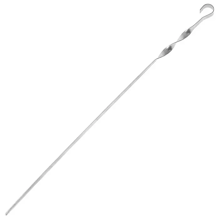 Шашлыки на шампурах — классическое и любимое угощение во время отдыха на природе. Стальная модель с никелевым покрытием не нагревается, устойчива к воздействию кислот и солей. Угловой шампур с витой ручкой держится в нужном положении, что позволяет правильно переворачивать и равномерно прожарить мясо.