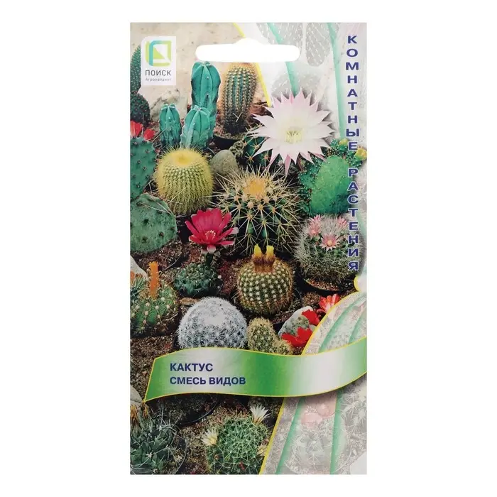Кактус смесь видов включает лобивию, ребуцию, корифанту, мамиллярию, цереус и другие. Различная форма стеблей, размеры и окраски колючек. Культура нетребовательная. Данная смесь имеет длительный период всходов. Высевается в феврале-мае в неглубокую емкость с хорошим дренажом и легкой землей. Присыпается слоем равным толщине семени и накрывается стеклом. Выдерживается при температурах +20-25 °С, притеняя от прямых солнечных лучей. Всходы формируются на 8-10 день. Не выносит избыток влаги.