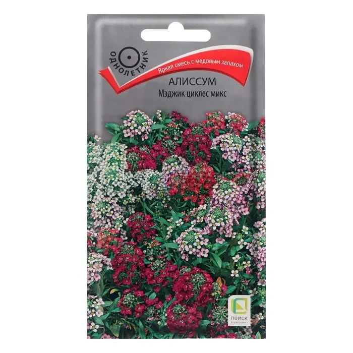 Семена алиссума от торговой марки «Поиск» формируют яркую смесь с медовым запахом для ковровых цветников и обрамления цветочных бордюров.