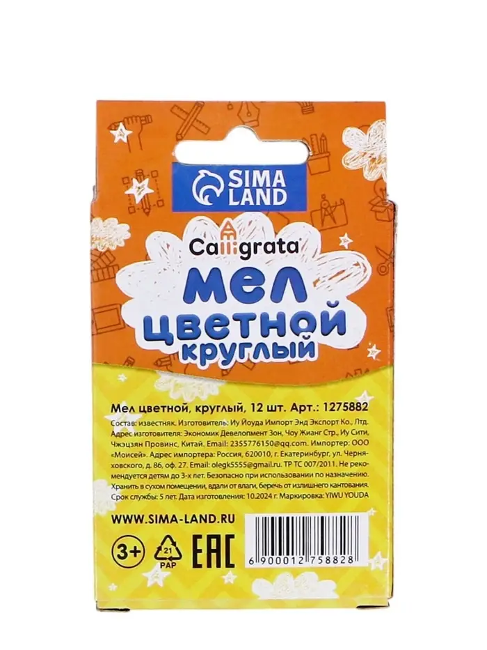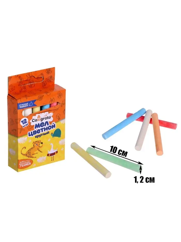 Мел школьный, цветной, набор 12 штук, круглый, в картонной коробке