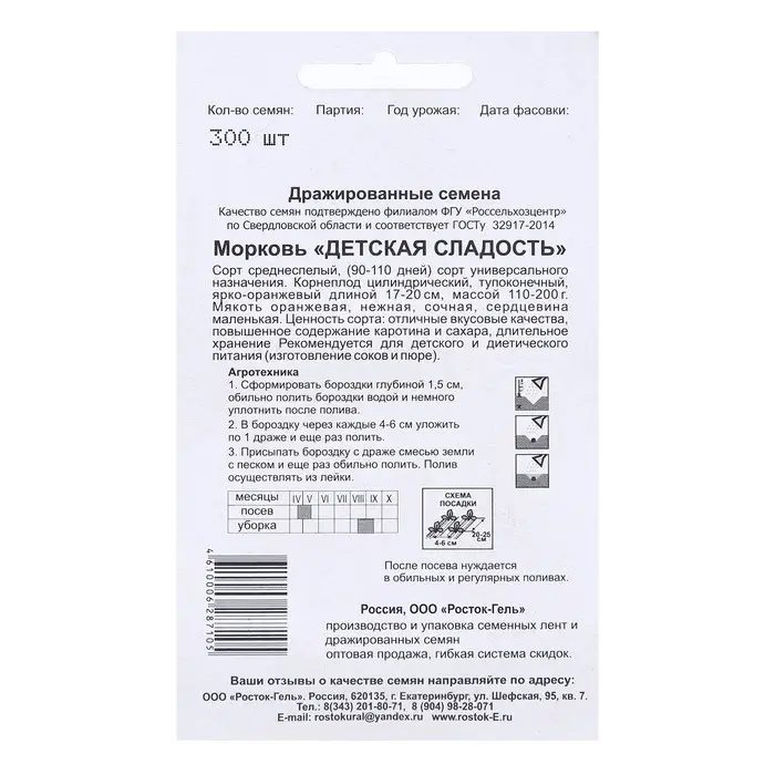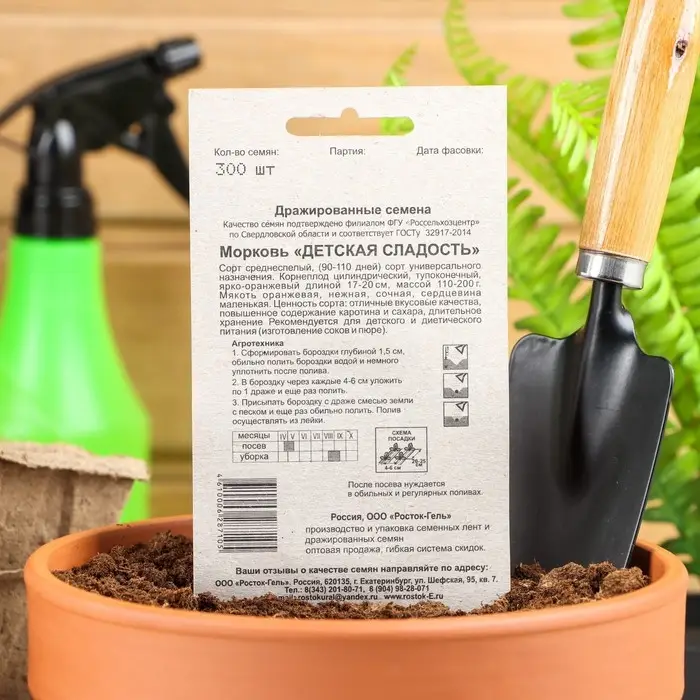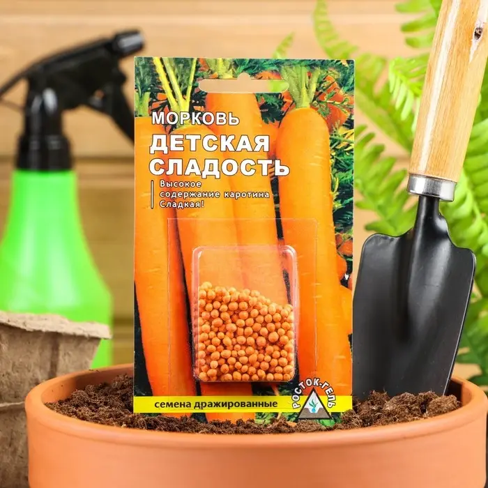 Корнеплод обладает насыщенным красно-оранжевым цветом, сладким вкусом, в длину достигает до 21 см. Семена покрыты специальной оболочкой с питательным составом, который обеспечивает стойкие и быстрые всходы. Морковь «Детская сладость» идеальна для употребления в свежем виде, также подходит для производства соков, пюре и в качестве компонента заготовок. Лидер по содержанию витаминов и каротина среди среднеспелых сортов.