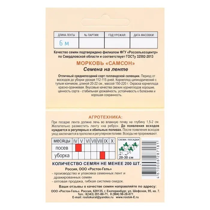 Семена Морковь "САМСОН" Семена на ленте, 6 М