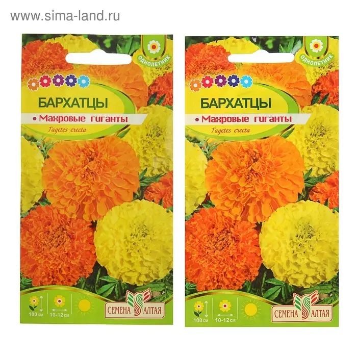 Высокорослые бархатцы с крупными махровыми соцветиями будут украшать Ваш сад с июня до самых заморозков. Растение неприхотливо и отличается длительным цветением. Куст высотой до 100 см с явно выраженным главным побегом. Соцветия крупные (8-10 см в диаметре) густомахровые различной окраски: оранжевой, золотисто-желтой и лимонно-желтой. Листья перисто-рассеченные от светло- до тёмно-зелёных. Применяются для посадки в цветники, на клумбы, бордюры и на срезку. Растение светолюбиво, засухоустойчиво, нетребовательно к почве и влаге, но при избытке влаги крупные соцветия начинают загнивать.
