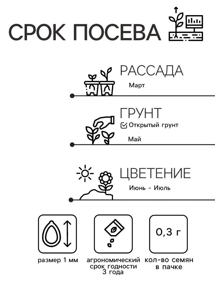Посев на рассаду в марте-апреле. Через 3-4 недели после всходов сеянцы пикируют. В открытый грунт на постоянное место рассаду высаживают в мае. Цветение с июля до заморозков. Удаление увядших соцветий способствует более пышному и продолжительному цветению.