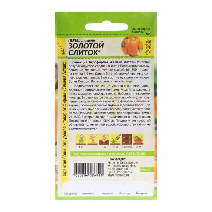 Раннеспелый сорт. Растение полураскидистое, средней высоты. Плоды пониклые, кубовидные, глянцевые, желтые, массой 161 – 300 г, толщина стенки 7 – 9 мм. Удивит богатый урожай крупных, сочных, сладких плодов. Этот сорт не нуждается в переработке. Покорит Вас в салатах и свежем виде. Можно выращивать после моркови, капусты, свеклы, бобовых (кроме фасоли) и тыквенных культур. Перец нельзя размещать вместе с огурцами. Выращивается рассадным способом. Для получения рассады семена высевают в феврале в посевные ящики с почвенной смесью. Ящики, накрытые пленкой (стеклом) помещают в теплое место. Оптимальная температура для прорастания семян 23 – 25°С. В открытый грунт высаживать в начале июня.