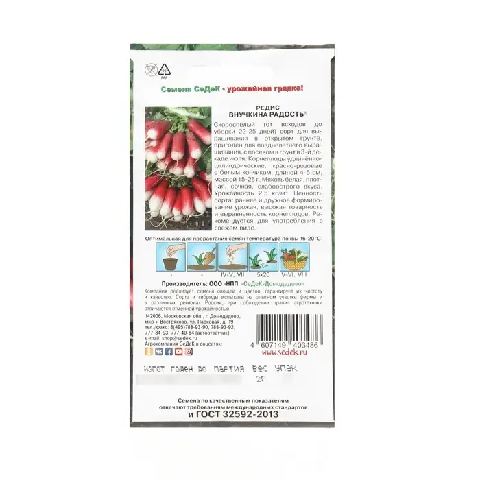 Скороспелый (от всходов до уборки 22-25 дней) сорт для выращивания в открытом грунте, пригоден для позднелетнего выращивания, с посевом в грунт в 3-й декаде июля. Корнеплоды удлинённо-цилиндрические, красно-розовые с белым кончиком, длиной 4-5 см, массой 15-25 г. Мякоть белая, плотная, сочная, слабоострого вкуса. Урожайность 2,5 кг/м². Ценность сорта: раннее и дружное формирование урожая, высокая товарность и выравненность корнеплодов. Рекомендуется для употребления в свежем виде.