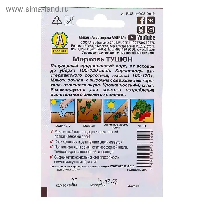 «Тушон» — это скороспелый сорт моркови, у которого период от посева до сбора урожая составляет 100–105 дней.