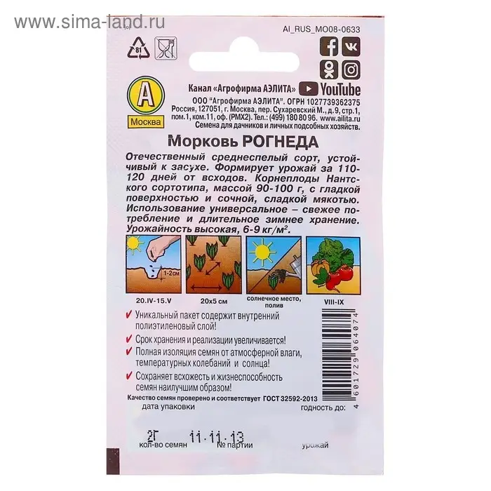 «Рогнеда» — это среднеспелый сорт моркови, у которого период от всходов до технической зрелости составляет 105–108 дней. Обладает хорошей лёжкостью.