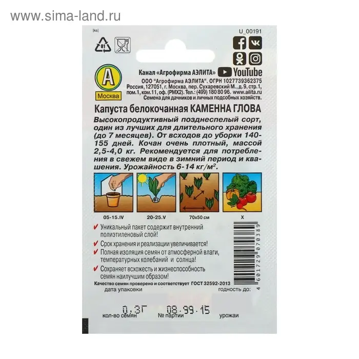Семена Капуста белокочанная "Каменна глова" "Лидер", позднеспелый, 0,3 г ,
