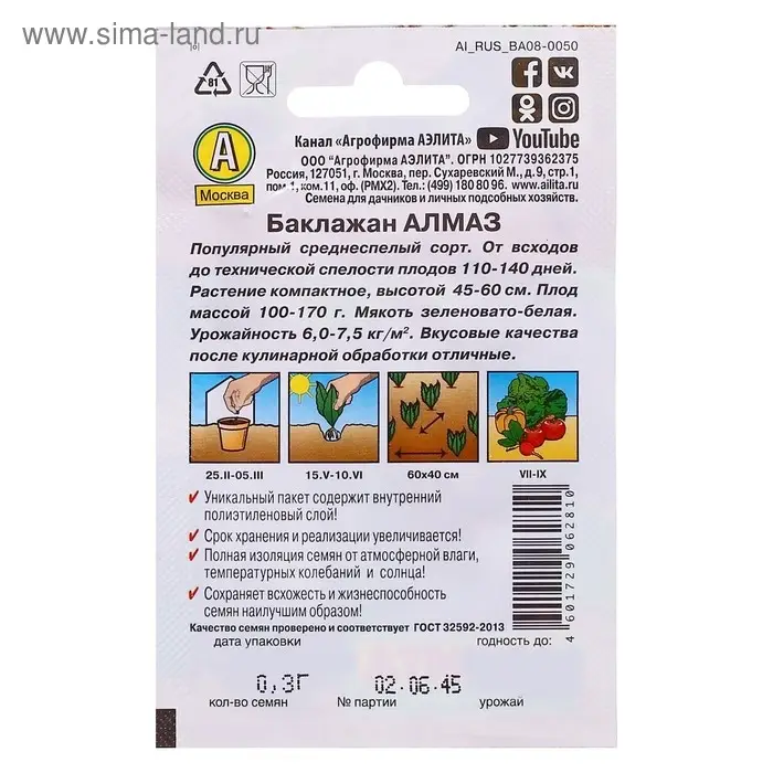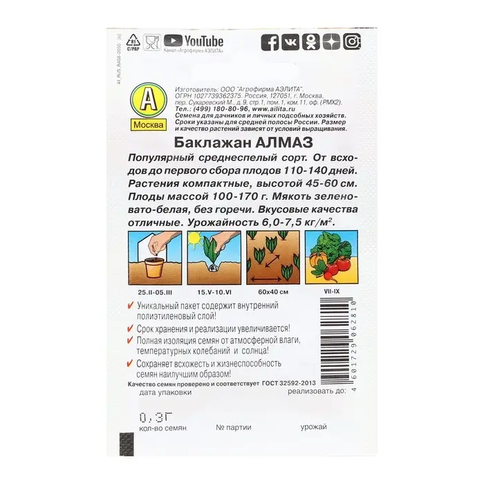 Благодаря внутреннему полиэтиленовому слою пакет не пропускает влагу и увеличивает срок годности семян до 2-ух лет.