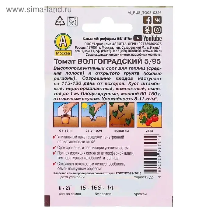 Семена Томат "Волгоградский 5/95" "Лидер", 0,2 г ,