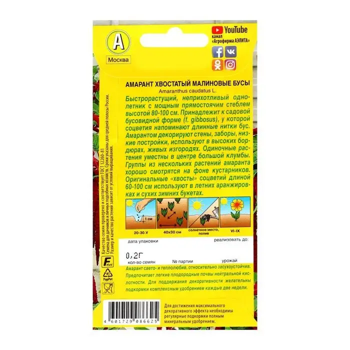 Семена цветов Амарант "Малиновые бусы", О, 0,2 г