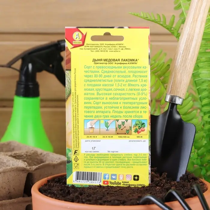 «Медовая лакомка» — это среднеспелый сорт дыни, у которого период от появления всходов до начала созревания длится 80–90 дней. Подходит для открытого грунта и плёночных теплиц. Устойчив к температурным перепадам и болезням листового аппарата.