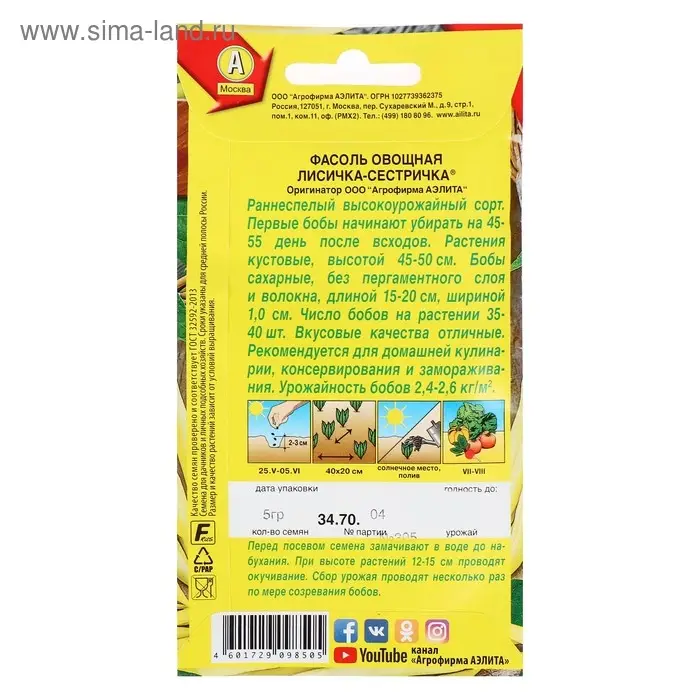 «Лисичка-сестричка» — это раннеспелый сорт фасоли, у которого период от всходов до технической спелости длится 45–55 дней. Урожайность составляет 2,4–2,6 кг/м².