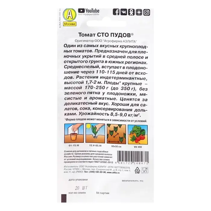 Семена Томат "Сто пудов", индетерминантный,высокорослый, 20 шт