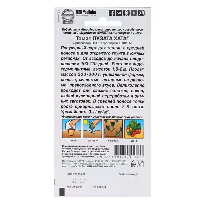 Семена Томат "Пузата хата", скороспелый, индетерминантный,высокорослый, 20 шт.