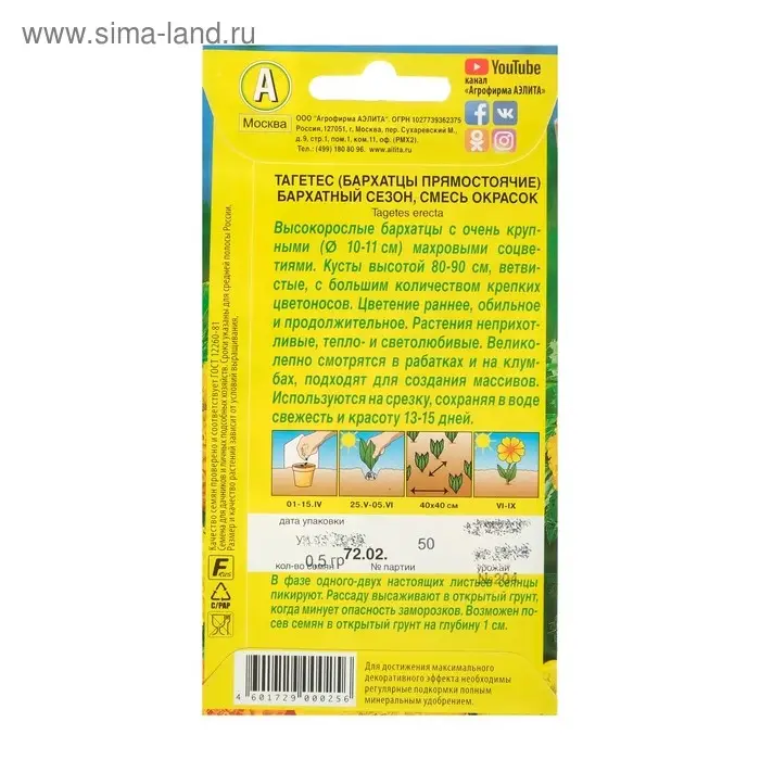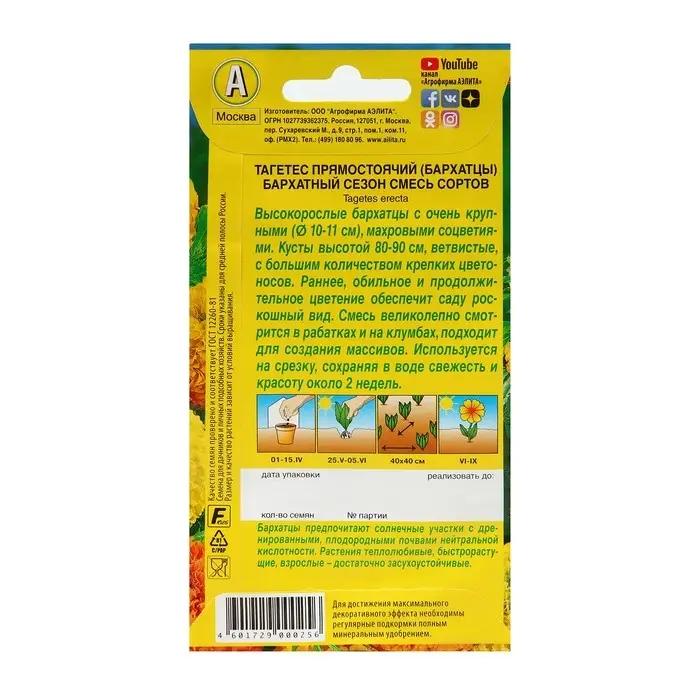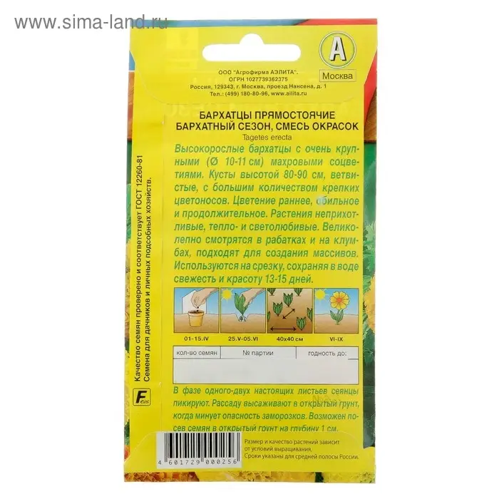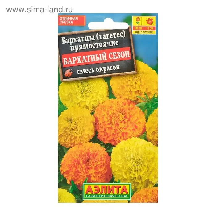 Семена цветов Бархатцы "Бархатный сезон" прямостоячие, смесь окрасок, О, 0,1 г