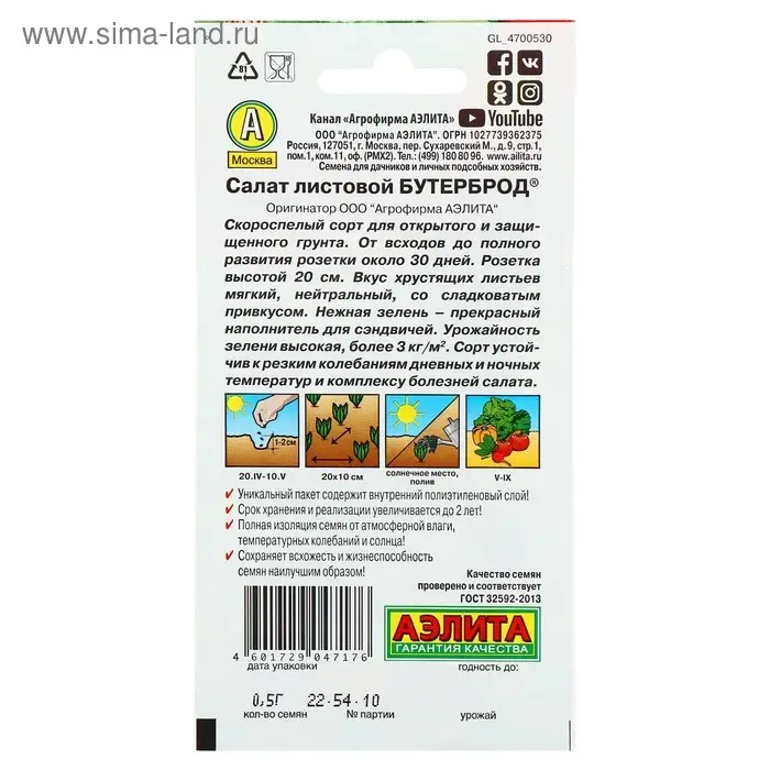 Семена Салат "Бутерброд" листовой, 0,5 г