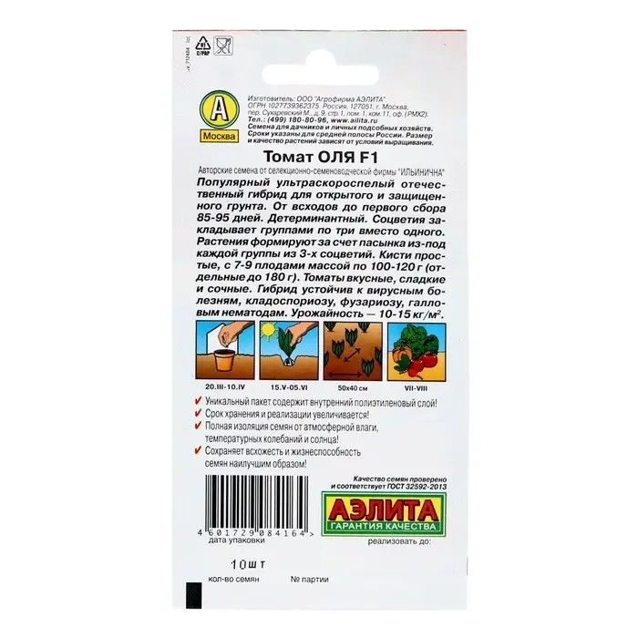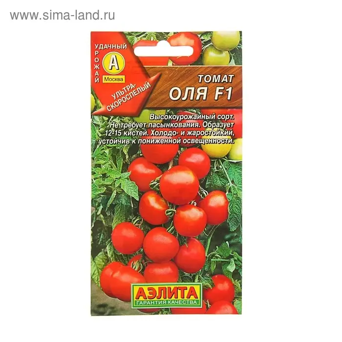 «Оля F1» — это ультраскороспелый отечественный гибрид, который подходит для открытого и защищённого грунта. Он жаро- и холодостойкий, стабильно завязывает плоды в условиях +7 °С ночью,+15 °С днём, не сбрасывая завязей. Не подвержен вирусным болезням, кладоспориозу, фузариозу и галловым нематодам.