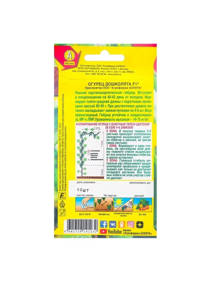 «Дошколята» — это среднеспелый партенокарпический сорт для открытого грунта и плёночных укрытий. Плодоношение начинается на 46–50 день от всходов.