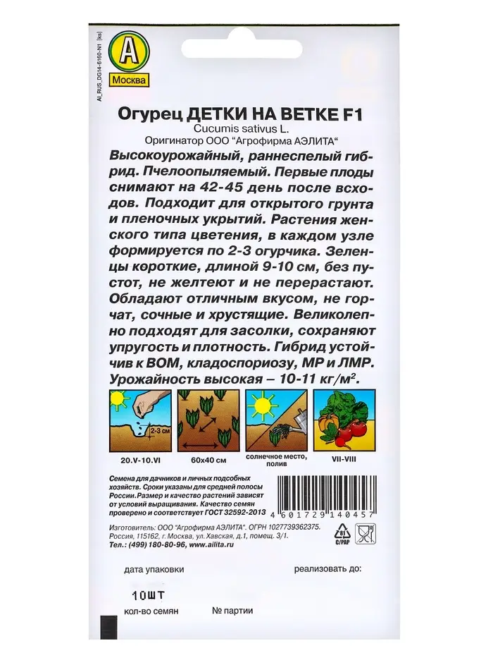 «Детки на ветке» — это раннеспелый пчелоопыляемый сорт для открытого грунта и плёночных укрытий. Плодоношение начинается на 42–45 день от всходов.