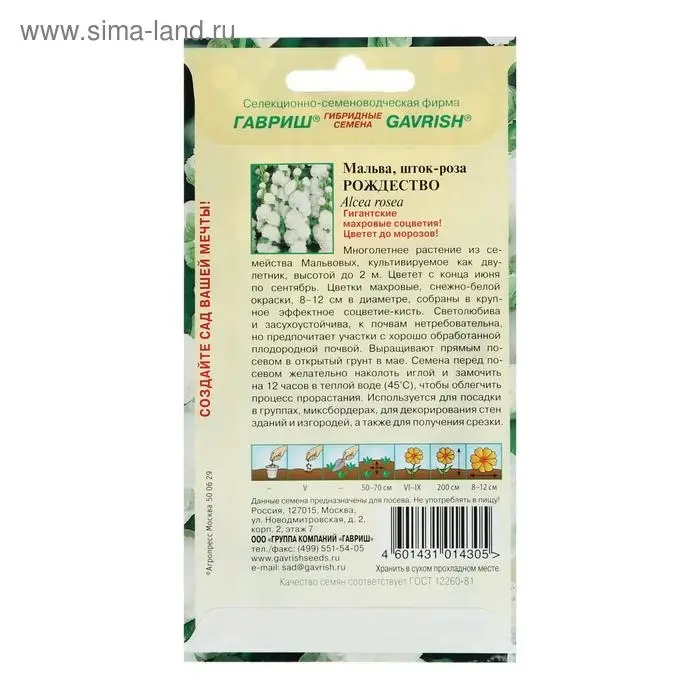 Многолетнее растение из семейства Мальвовых, культивируемое как двулетник, высотой до 2-2,5 м. Цветет с конца июня по сентябрь. Цветки махровые, снежно-белой окраски, 8-12 см в диаметре, собраны в крупное эффектное соцветие-кисть. Светолюбива и засухоустойчива, к почвам нетребовательна, но предпочитает участки с хорошо обработанной плодородной почвой. На зиму желательно укрывать. Выращивают прямым посевом в открытый грунт в мае. Используется для посадки в группах, миксбордерах, для декорирования стен зданий и изгородей, а также для получения срезки.