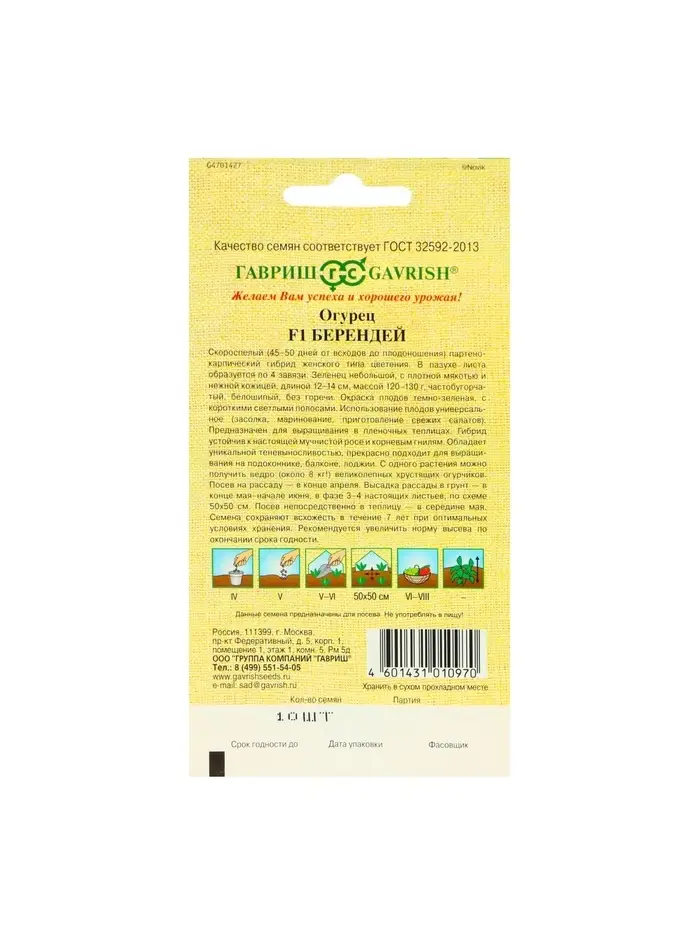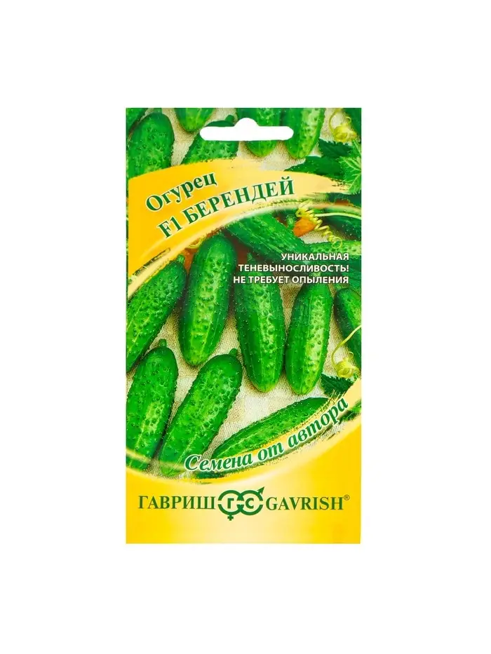 «F1 Берендей» — это скороспелый партенокарпический гибрид женского типа цветения, у которого период от всходов до плодоношения составляет 45–50 дней. Устойчив к настоящей мучнистой росе и корневым гнилям. Обладает уникальной теневыносливостью. Предназначен для культивирования в плёночных теплицах.
