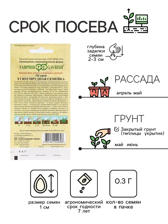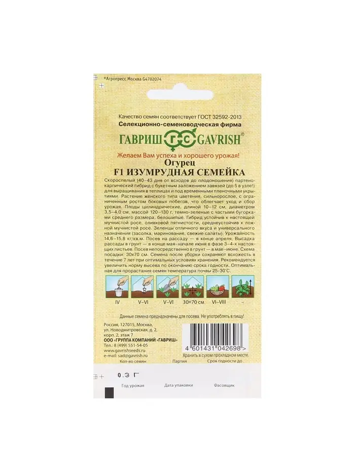 Семена Огурец "Изумрудная семейка" F1,корнишон, раннеспелый, партенокарпический, 0,3 г
