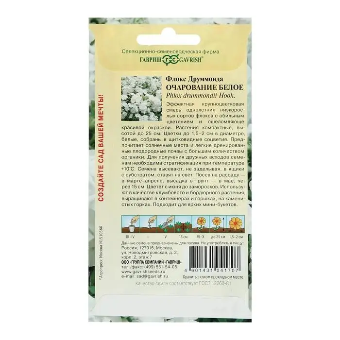 Семена цветов Флокс "Очарование белое", ц/п, друммонда, О, 0,05 г