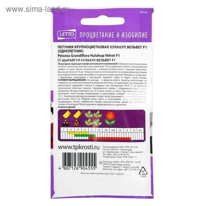 Петуния «Хулахул Вельвет F1» — гибридный сорт, образующий компактный кустик с хорошей ветвистостью и пышным цветением. Высота растения 25-35 см. Неприхотливость петунии делает ее незаменимым растением для создания композиции на клумбах, подвесных кашпо, вазонам. Прекрасно соседствует с бархатцами, цинерарией и настурцией.