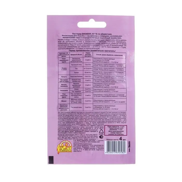«БИОКИЛЛ» не загрязняет окружающую среду, быстро разрушаясь в воде и почве. Срок ожидания от последней обработки до сбора урожая — не более 3-х суток. «БИОКИЛЛ» практически незаменимый препарат для защиты от вредителей смородины, крыжовника, малины, яблони и других плодовых деревьев, томатов, цветов (и в саду, и в комнате), ведь применение многих химических препаратов разрешено только не позднее 20 дней до сбора урожая.