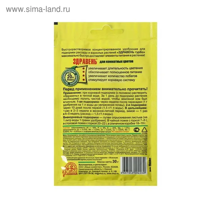 «ЗДРАВЕНЬ ТУРБО» увеличивает число побегов и листьев, способствует длительному и обильному цветению, более яркой окраске цветов и листьев. Укрепляет иммунитет растений и снижает негативное влияние ошибок в уходе.